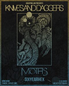Show Announcement! Sunday August 3rd at Fleetwood’s, Moths make their mighty return from Puerto Rico on the heels of a brand new album out a few days prior! Joining them is SixYearHex, a powerful duo from Winston Salem who are creating quite a buzz with their debut album and massive live performance. Closing out the night is Asheville veterans Knives and Daggers who, for 20 years, have brought their powerful post rock/metal music to the stage! Don’t miss this epic event!